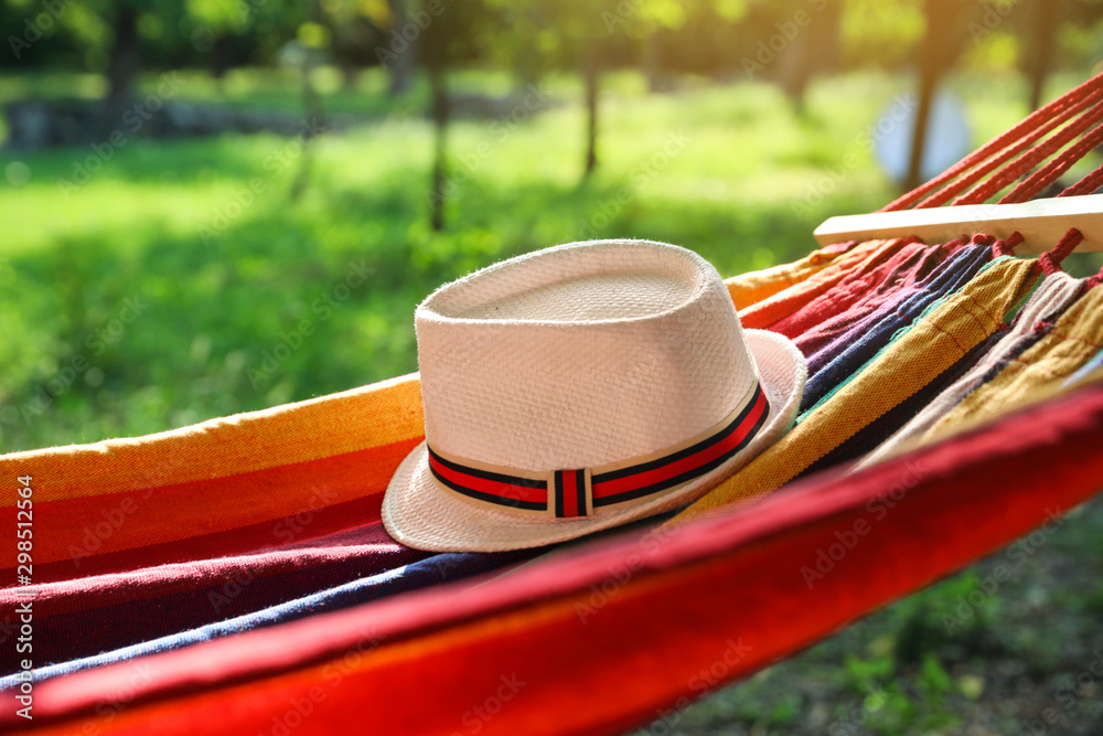 Bright comfortable hammock with hat hanging in green garden, closeup