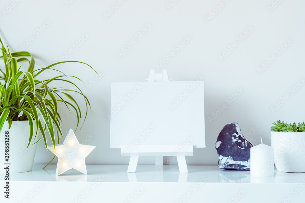 White scandinavian home interior design. Green plants in pots, star shape lamp, blank canvas on a stand, and stone detail on wall background. Minimalist simple hygge room decor. Close up. Copy space.