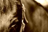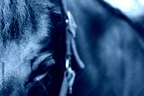 Close-up, shallow focus of the detailed eye and surrounding area of an adult horse. Also in view is part of the harness used to lead him from his stables.