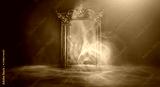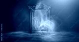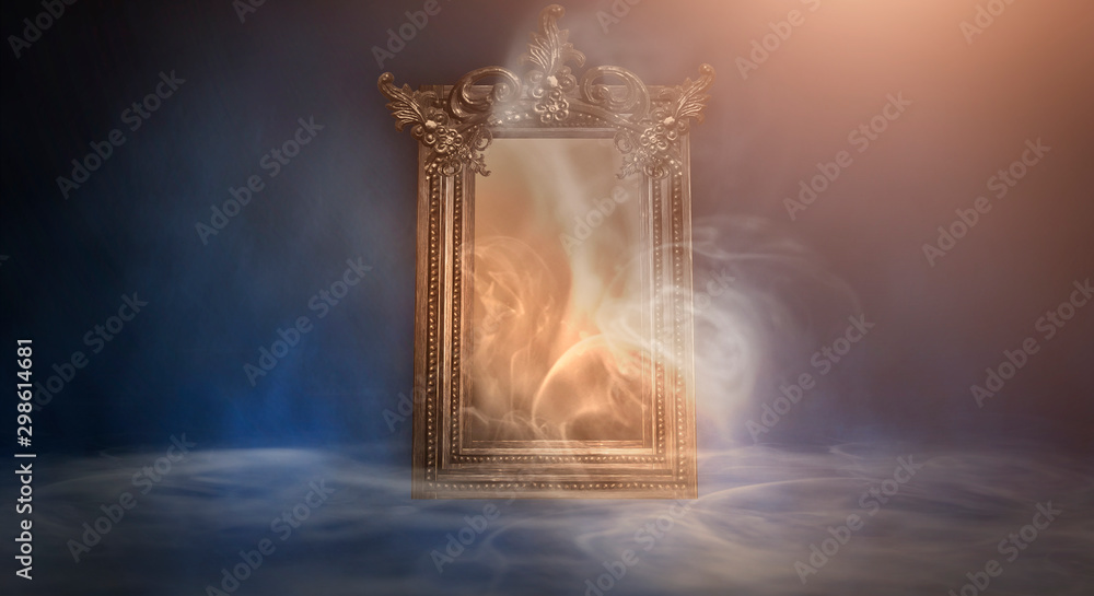 Dark room, a magical antique mirror. Night view of the room, fantasy. Dark abstract background with a mirror. Neon light, smoke, smog, magic dust.