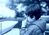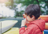 Kid having allergy, itchy and rubbing eyes while playing by the lake, little boy scratching nose, Children has reflection or hay fever from pollen, Allergies and asthma issues in kids
