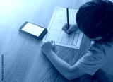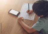 Cropped shot of preschool kid using mobile phone for his homework, Selective focus of Child doing homework by using cell phone searching information on internet, Home schooling education concep