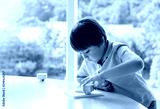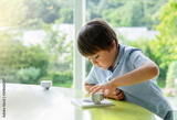 High key portrait of school kid playing game in playroomwith blurry natural background, Child holding bottom game with wondering face in a sunny room next to window, Learn and play, Education concept