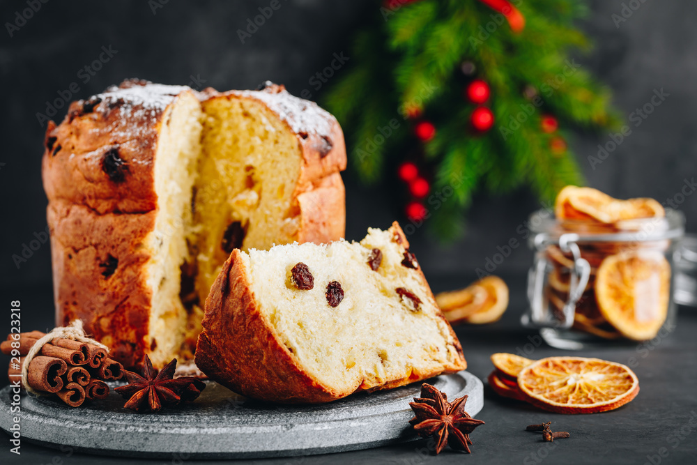 Traditional Christmas Panettone cake with dried fruits on dark stone background