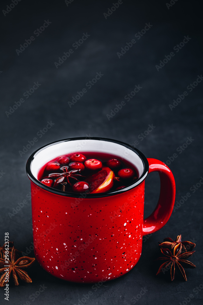 Traditional Christmas Mulled Wine drink with cranberries, orange slices and spices in red mug