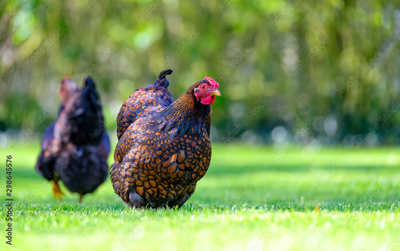 Pair of adult Wyandotte hens seen feeding from grains thrown onto a lawn. The birds, part of a free range flock are kept as pets.