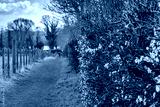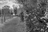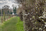 Spring time rural scene of a blossoming hedgerow seen adjacent to a grassy path and a farm fence. The distant shows an adult person walking a dog towards the horizon.