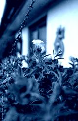 Shallow focus view of a freshly prepared hanging basket, showing the young purple flower detail as seen after a light rain shower. The basket is made of home-made weaves, hanging on a cottage wall.