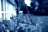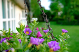 Shallow focus view of a freshly prepared hanging basket, showing the young purple flower detail as seen after a light rain shower. The basket is made of home-made weaves, hanging on a cottage wall.