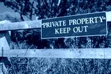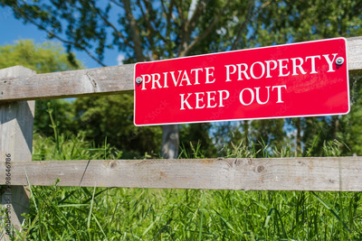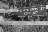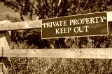 Shallow focus of a newly installed Private Property sign seen on a time fence near the entrance to a private paddock. The area has been subject to thefts.