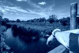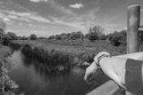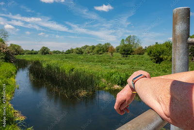 Woman with folded arms seen on a small river bridge in the English countryside. She is wearing a fitness watch and her arms are tanned.