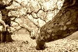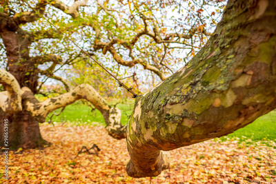 Close-up, shallow focus on an ancient maple tree seen in an english park. The tree is very old, and most of the leaves are seen fallen around its base in early winter.