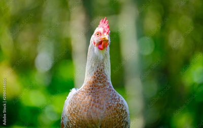 Adult Hen Chicken seen looking at the photographer, the bird, part of a domestic flock is located in a residential garden.
