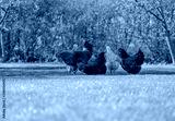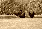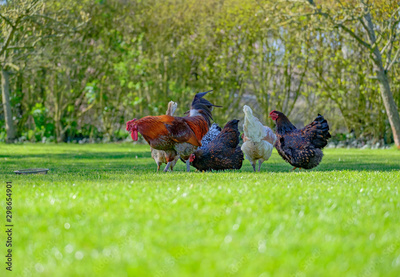 Flock of domestic chickens of various varieties, with a solitary rooster, in a domestic garden in springtime.