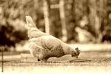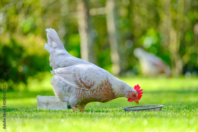 Adult Hen Chicken seen looking at the photographer, the bird, part of a domestic flock is located in a residential garden.