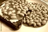 Close-up of freshly prepared, traditional Beans on Toast, in this case wholemeal bread. Ready to eat, the healthy snack can be seen on a wooden dinning table.