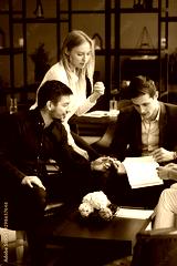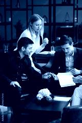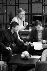 Group of clever business people reading a document in the office with modern interior. close up photo. paperwork. teamwork