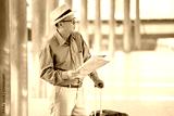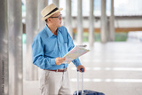 happy asian Senior man tourists sightseeing with map and searching destination in urban city outdoors. old Travellers lifestyle . elderly male vacation . ageing society traveling concept . lonely