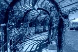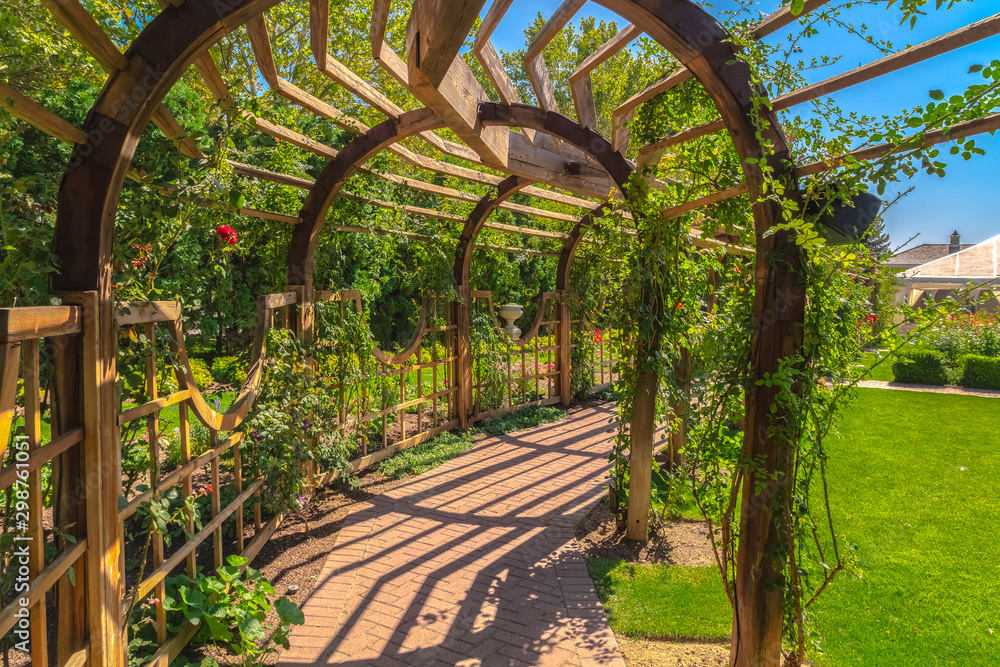 Wooden arbor at a wedding venue with lush green plants and stone brick pathway