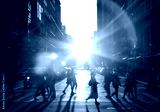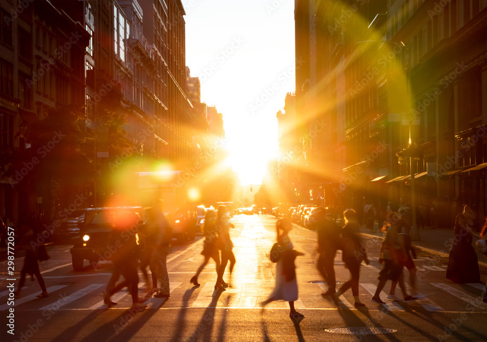 People walking across the street in New York City with the bright light of sunset shining between the buildings along 23rd St in Midtown Manhattan
