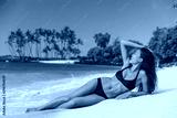 Swim beach Asian bikini model woman sunbathing touching healthy long hair in black swimwear lying down on sandy beach, Hawaii summer vacation. Spa wellness concept.