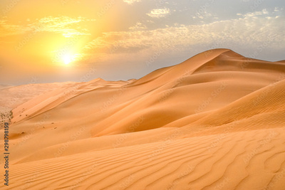 Sunset at the Edge of the Rolling Sand Dunes in the Empty Quarter (Arabian Desert) outside Abu Dhabi, United Arab Emirates