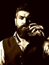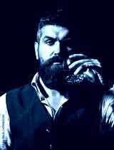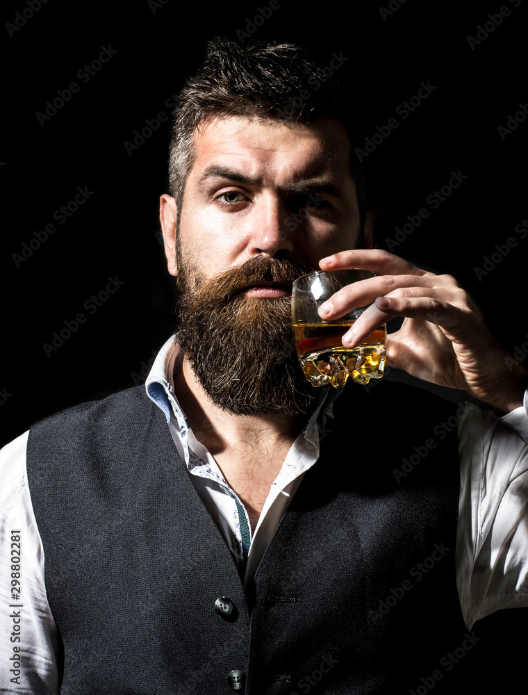Sommelier tastes expensive drink. Bearded businessman in elegant suit with glass of whiskey. Degustation, tasting. Man with beard holds glass of brandy
