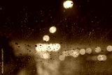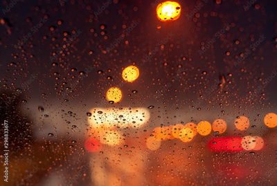 Orange night light bokeh from street light on traffic jam day. Rainy day. Transparent glass window with rain drop. Romantic weather. City life. Blur abstract background of urban light on rainy season