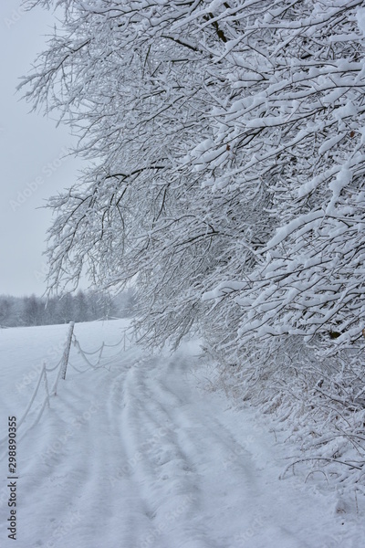Beautiful winter landscape, white, cold wet snow enveloping the forest.