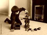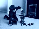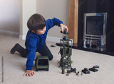 Portrait of School boy sitting on carpet floor playing with soldiers, military car and figurine toys, Happy Kid playing wars and peace on his own at home, Children imagination and development