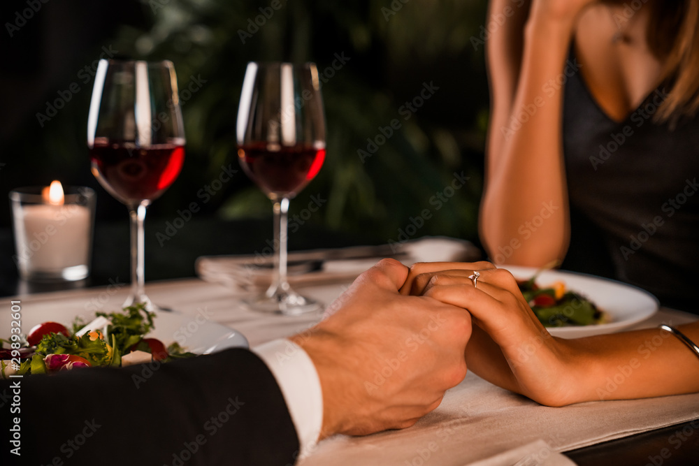 Close up shot of couple hands on restaurant table with two glasses of wine and food