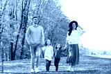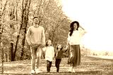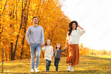 Happy family with little daughters walking in autumn park