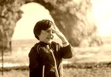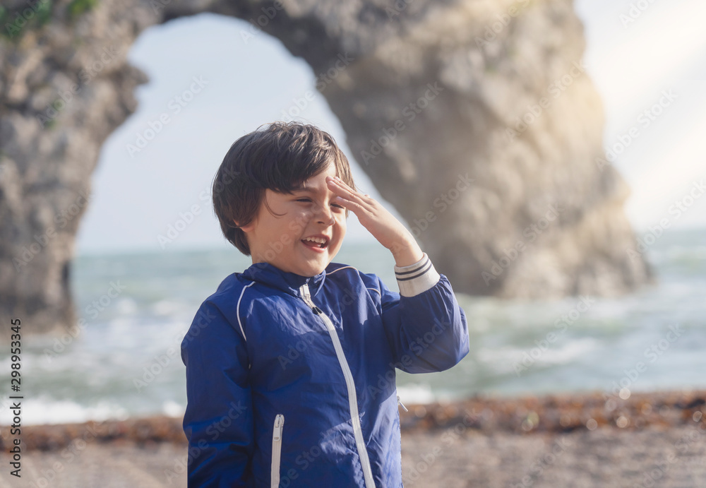 Portrait of happy kid boy smiling standing by the sea with blurry background, Chid playing in the Durdle Door beach in the weekend, Shot in Dorset, England, United Kingdom