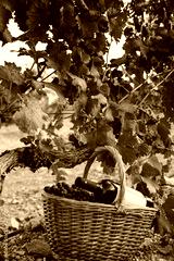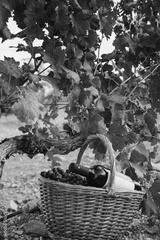 Basket of grapes with a bottle of wine in the vineyard