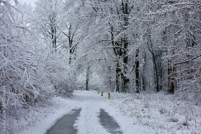 Beautiful winter landscape, white, cold wet snow enveloping the forest.