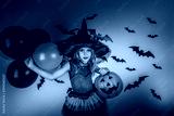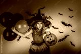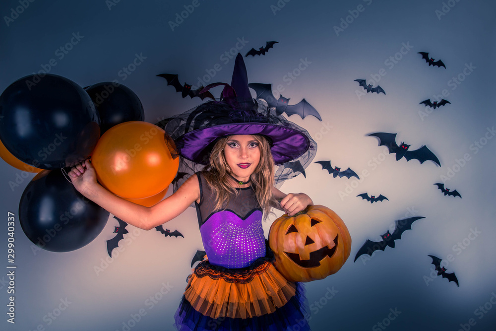 Little girl in a costume of witch with witch hat celebrates Helloween