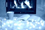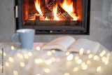Open book, cup of tea and luminous garland near burning fireplace. Hygge concept