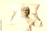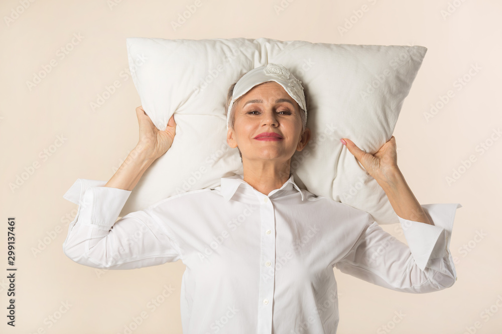 stylish beautiful aged woman lies on a pillow in a white shirt on a beige background