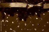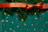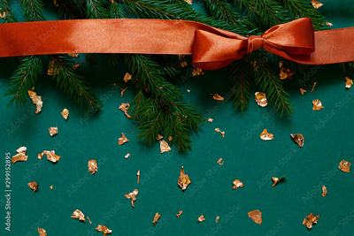 Gold foil concept Christmas or New Year festive frame on the green paper background. Copy space
