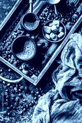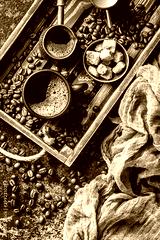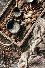 Coffee on wooden tray with coffee beans on dark textured background. Top view with copy space. Background with free text space.