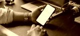Cropped shot of businessman holding blank screen smartphone while working on his project