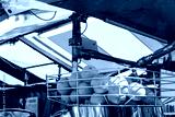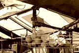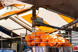 Isolated, ripe oranges seen above a orange juice press located in a market stall. Used to prepare fresh OJ which will be sold to members of the public.