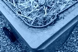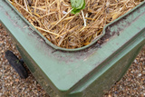 Shallow focus image of green waste including rabbit hutch straw seen in a green, local council wheelie bin ready for collection near a house.