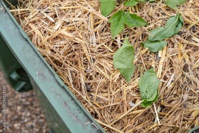 Shallow focus image of green waste including rabbit hutch straw seen in a green, local council wheelie bin ready for collection near a house.