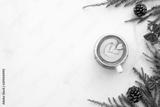 White marble table with cup of latte coffee and Christmas decoration with pine branches and pine cones. Christmas and new year celebration concept. Top view with copy space, flat lay.