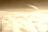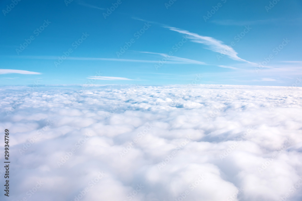 Aerial view of cloudy fields and horizon with day blue sky.