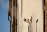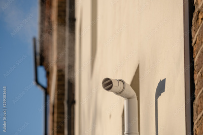 Detailed view of a newly installed steam ventilation pipe attached to a condenser boiler within a private home. Steam can be seen as being vented from the pipe.