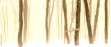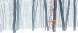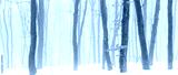 Wide panorama of beautiful snowy forest at foggy winter day with tonal perspective and contrast yellow leaves on foreground.