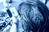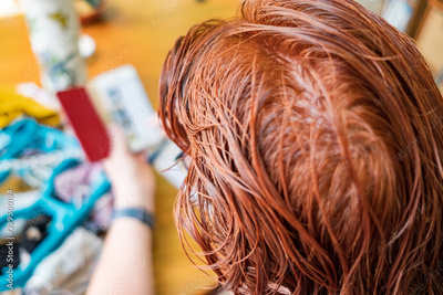 Very shallow focus of some of the newly dyed hair seen on a middle aged woman at home. She is seen using a mobile phone to check bills while her hair is drying out.