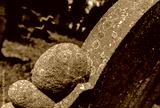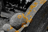 Abstract view of kitchen seen growing on an old and weathered headstone at a cemetery.